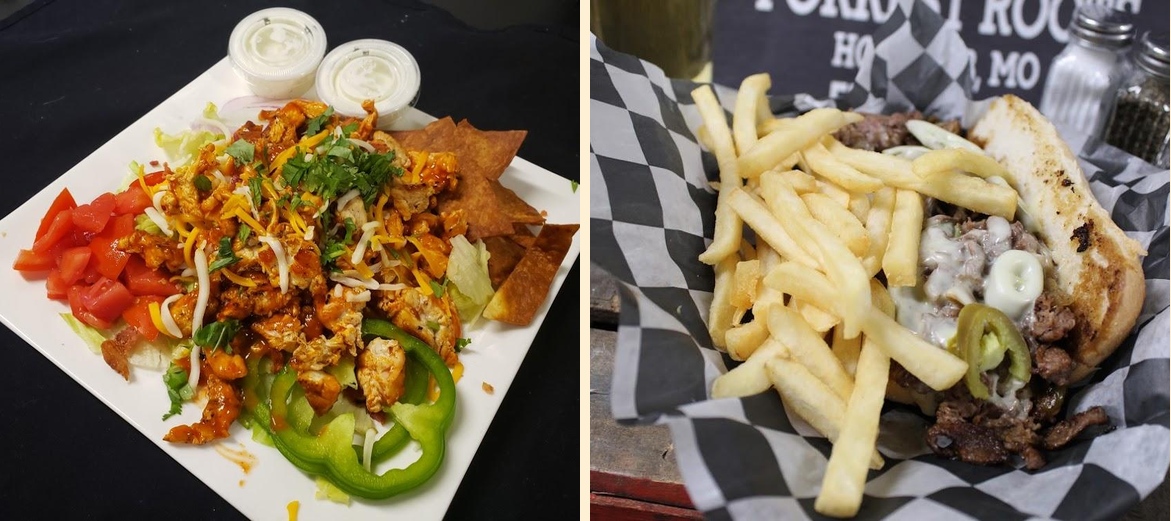 Must-try dishes include the Bootheel Double Cheese Burger, BBQ Pulled Pork Sandwich, and Jumbo Shrimp Basket. The Buffalo Chicken Quesadilla also stands out and makes for a perfect appetizer!
